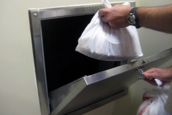3. Open the metal door and drop the garbage down the tunnel.